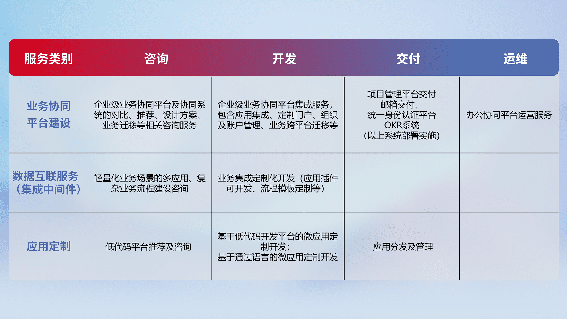 针对钉钉、、、企微、、IDaas等平台级产品提供产品的规划、、、、方案、、、、交付、、、、定制化开发等服务,,,实现如统一协同办公、、、、智能客户服务、、混合会议管理、、、、智能数据查询、、、等业务场景,,,实现数字化转型。。
